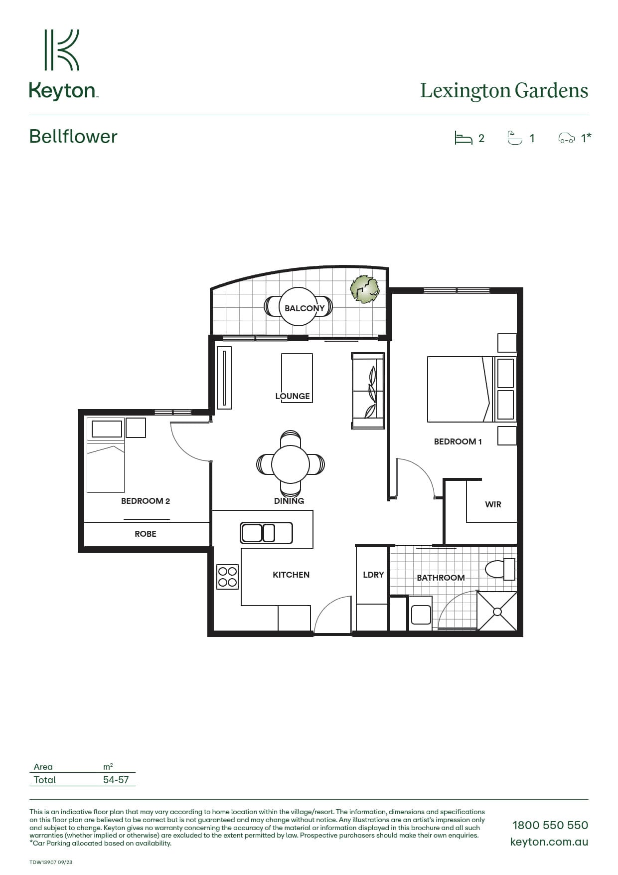 The Bellflower floorplan at Lexington Gardens is a two bedroom floorplan. The size of the apartments range from 54 - 57 square metres.