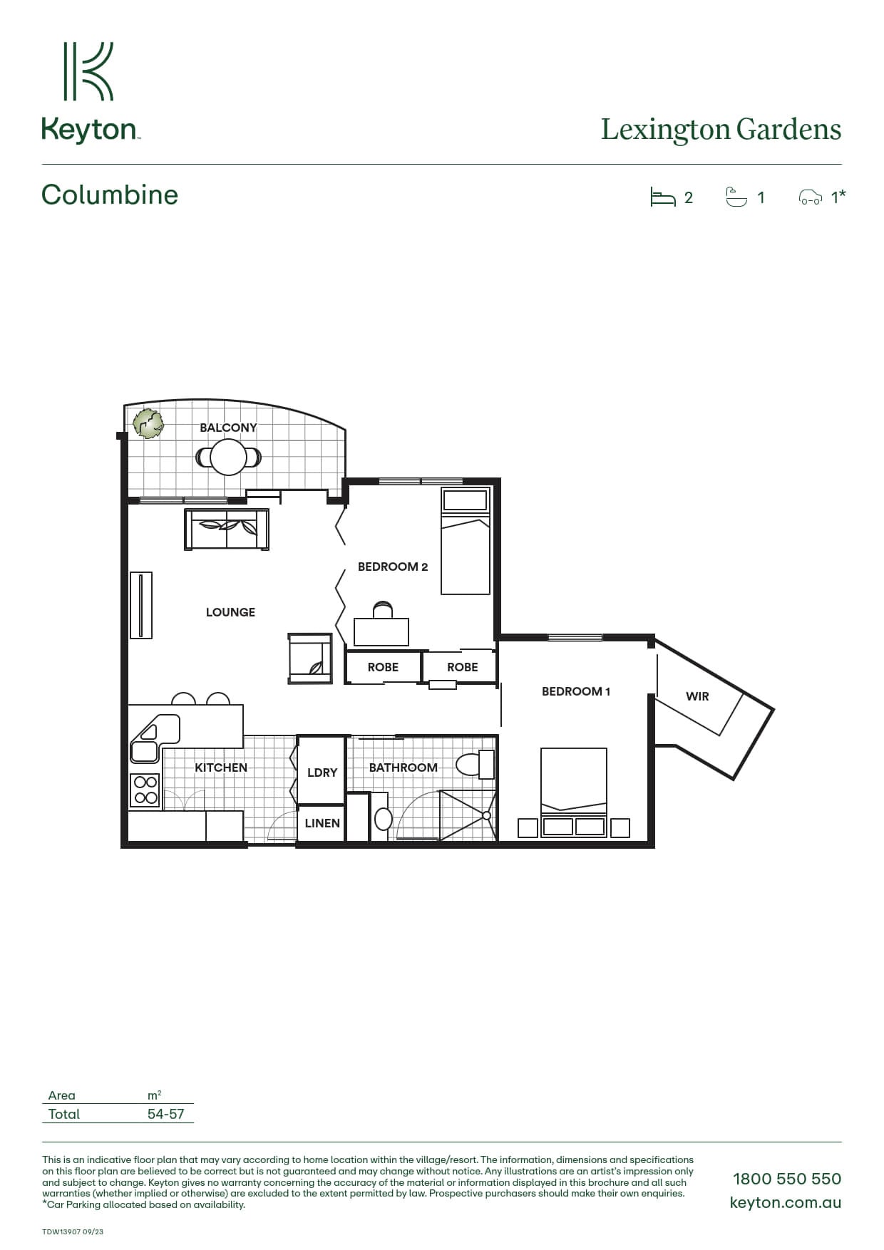 The “Columbine” floorplan at Lexington Gardens presents a range of one bedroom plus study or two bedroom apartments, each spanning 54 to 57 square metres, designed for a sophisticated lifestyle.