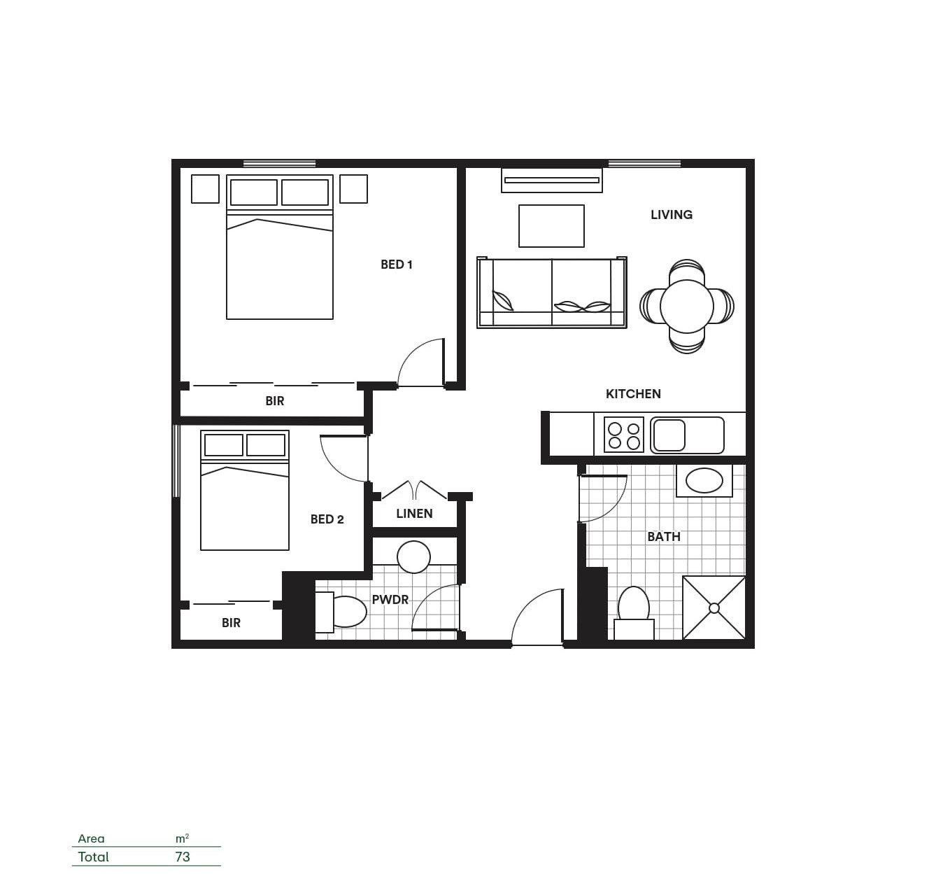 The Southerngum floorplan is a generously sized 73 square metres serviced apartment at Meadowvale. The Southerngum floorplan is the perfect apartment for guests and entertaining. In addition, the 2 spacious bedrooms have built-in robes along with a linen storage, providing ample space for your laundry and other materials.