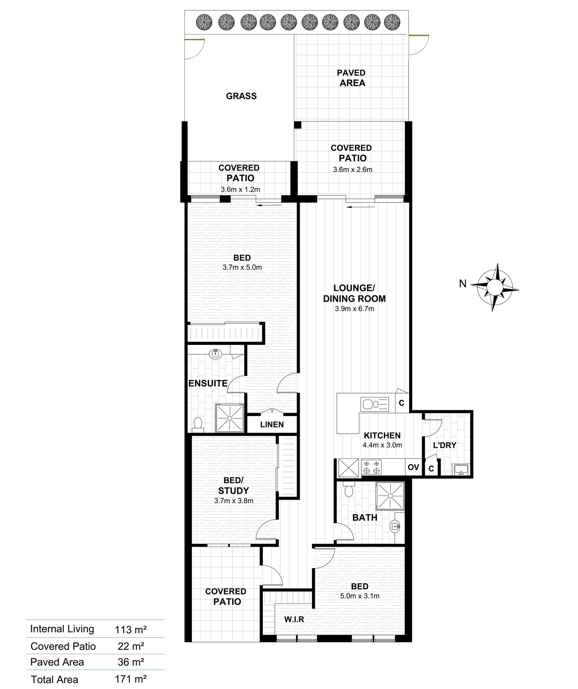 • Covered patio opening to paved outdoor area with grass section